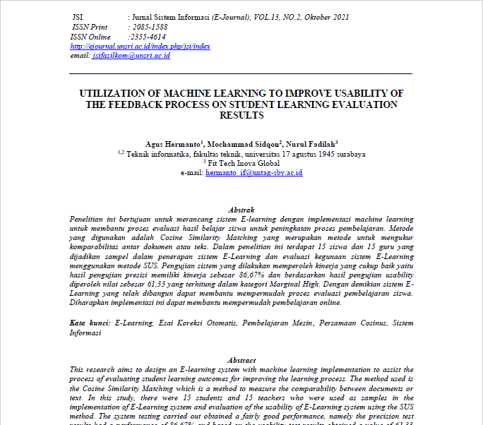 In Text Citation(Hermanto, 2021) Bibliography CitationHermanto, A. ., Sidqon, M. ., Fadilah, N. ., (2021). Utilization of machine learning to improve usability of the feedback process on student learning evaluation results. JSI: Jurnal Sistem Informasi (E-Journal), 2(13), . https://ejournal.unsri.ac.id/index.php/jsi/article/view/15646 In Text Citation1 Bibliography Citation1. Hermanto, A. ., Sidqon, M. ., Fadilah, N. ., Utilization of machine learning to improve usability of the feedback process on student learning evaluation results. JSI: Jurnal Sistem Informasi (E-Journal). 2021;2(13):. https://ejournal.unsri.ac.id/index.php/jsi/article/view/15646 In Text Citation(Hermanto 2021) Bibliography CitationHermanto, A. ., Sidqon, M. ., Fadilah, N. ., 2021. "Utilization of machine learning to improve usability of the feedback process on student learning evaluation results". JSI: Jurnal Sistem Informasi (E-Journal) 2(13), . https://ejournal.unsri.ac.id/index.php/jsi/article/view/15646 In Text Citation(Hermanto, 2021) Bibliography CitationHermanto, A. ., Sidqon, M. ., Fadilah, N. ., 2021. Utilization of machine learning to improve usability of the feedback process on student learning evaluation results. JSI: Jurnal Sistem Informasi (E-Journal) [online] 2(13), pp.. Available at: <https://ejournal.unsri.ac.id/index.php/jsi/article/view/15646> [Accessed 01 May 2026]. In Text Citation[1] Bibliography Citation[1]Hermanto, A. ., Sidqon, M. ., Fadilah, N. ., Utilization of machine learning to improve usability of the feedback process on student learning evaluation results. JSI: Jurnal Sistem Informasi (E-Journal), vol. 2, no. 13, pp., 2021. Available: https://ejournal.unsri.ac.id/index.php/jsi/article/view/15646. [Accessed 01 May 2026]. |